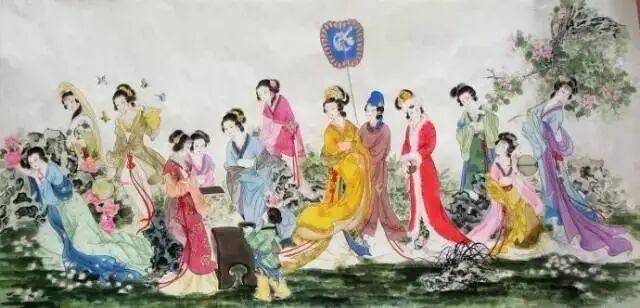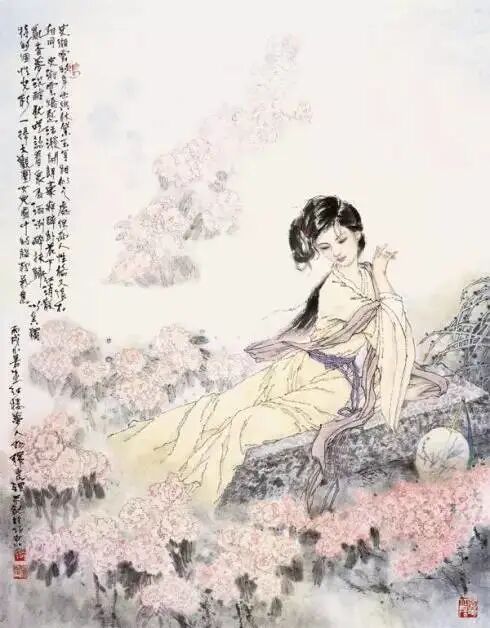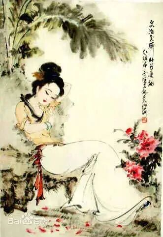 第62回:只见一个小丫头笑嘻嘻地走来:“姑娘们快瞧云姑娘去,吃醉了图凉快,在山子后头一块青板石凳上睡着了。”众人听说,都笑道:“快别吵嚷。”说着,都走来看时,果见湘云卧于山石僻处一个石凳子上,业经香梦沉酣,四面芍药花飞了一身,满头脸衣襟上皆是红香散乱,手中的扇子在地下,也半被落花埋了,一群蜂蝶闹穰穰地围着她,又用鲛帕包了一包芍药花瓣枕着……湘云慢启秋波,见了众人,低头看了一看自己,方知是醉了。