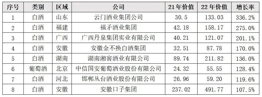 2022年度华樽杯酒企品牌价值增幅超过100%的8家酒企如下:(单位:亿元人民币)