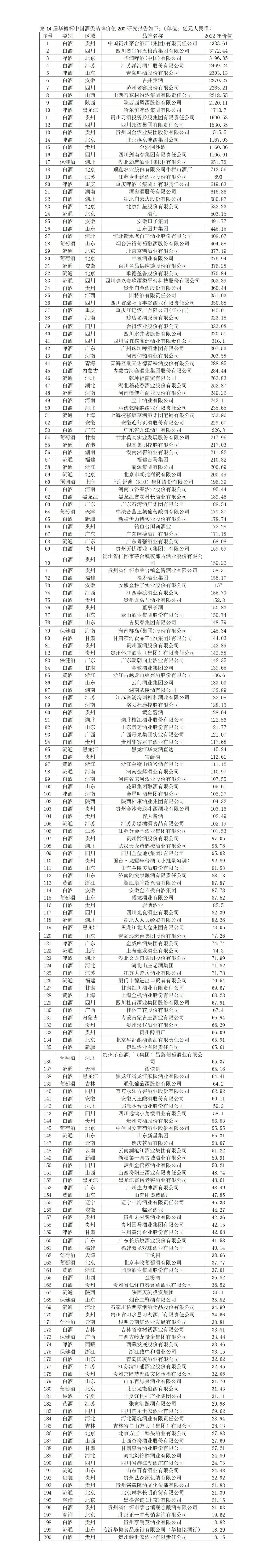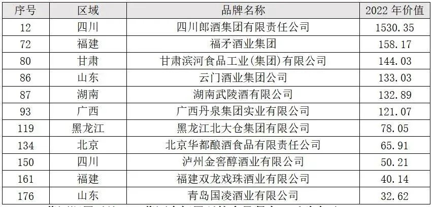 2022年度华樽杯“非贵州”酱酒的品牌价值名单:(单位:亿元人民币)