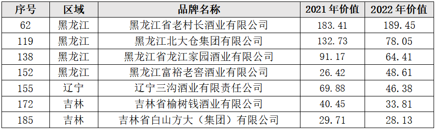 2022年度华樽杯东北白酒的品牌价值名单:(单位:亿元人民币)