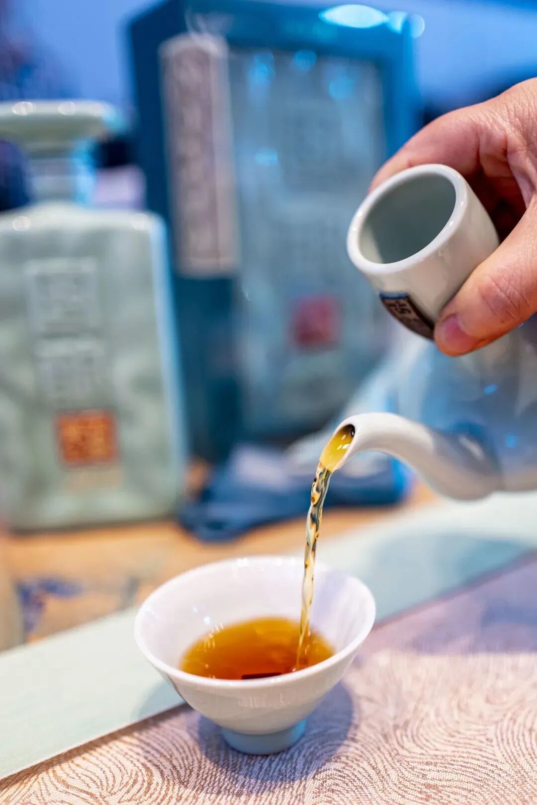 今天,请大家品鉴的是,古越龙山特制的高端品牌“国酿青玉”。它的灵感来自古越龙山董事长孙爱保先生在观看春晚舞蹈诗剧《只此青绿》。今年4月,古越龙山已和“中国演艺集团”联名推出“千里江山 只此青绿”、“千年国酿 只此青玉”联名款,并选为香港回归25周年的纪念酒。