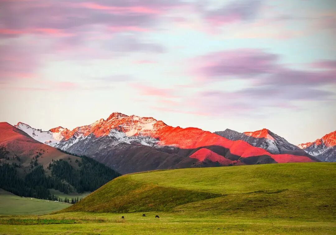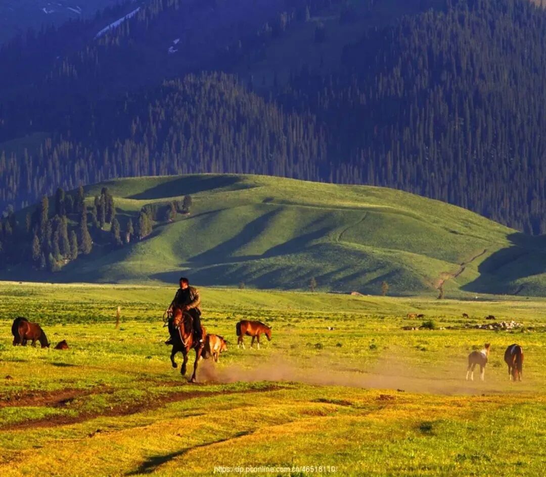那拉提的秋天,似乎是上帝匆忙间打翻了调色盘。河谷,山峰,森林交相辉映,金色的牧场上散落着点滴毡房,远处的雪山上被阳光撒上金色的光辉。让人不得不感叹一句,中国最美的秋色在新疆。