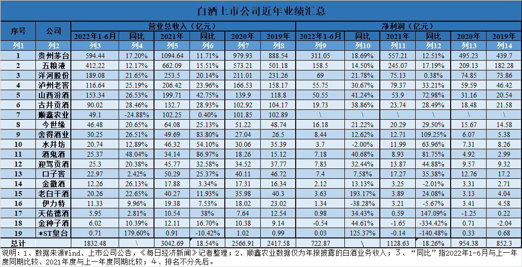具体业绩层面,Wind数据显示,2022年上半年,19家白酒上市企业合计实现营收1832.48亿元,净利润共计722.87亿元。