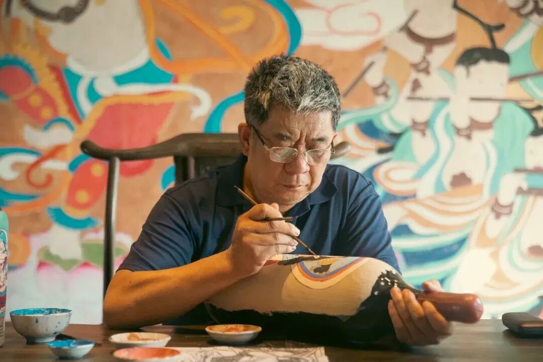 除了在地下酒窖复原壁画,楼兰还把壁画用于包装和宣传,这也是国家非物质文化遗产传承人、楼兰文化工作室主任余波老师的主要工作之一。每天,余波老师都会在自己的工作室内绘制酒瓶,绘画前,余波老师会用生土打底来当做画纸,再根据线描稿一点点将壁画复刻在酒瓶上,大概6、7个小时左右,一瓶定制壁画葡萄酒便完成了最后的设计包装。