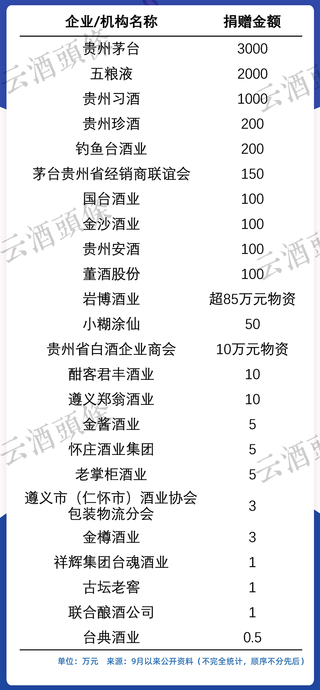 据云酒头条不完全统计,9月以来,已有20余家酒企或团体进行捐赠,累计捐赠款物价值超7000万元。
