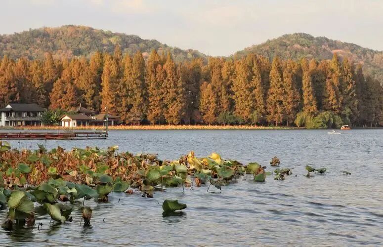 金秋时节的杭州西湖,与众不同,各色交织的秋叶,在山、水、亭、院、桥、船相衬下,色彩绚丽夺目,美得灵气诗意。蓝天碧水,湖光山色,美不胜收。