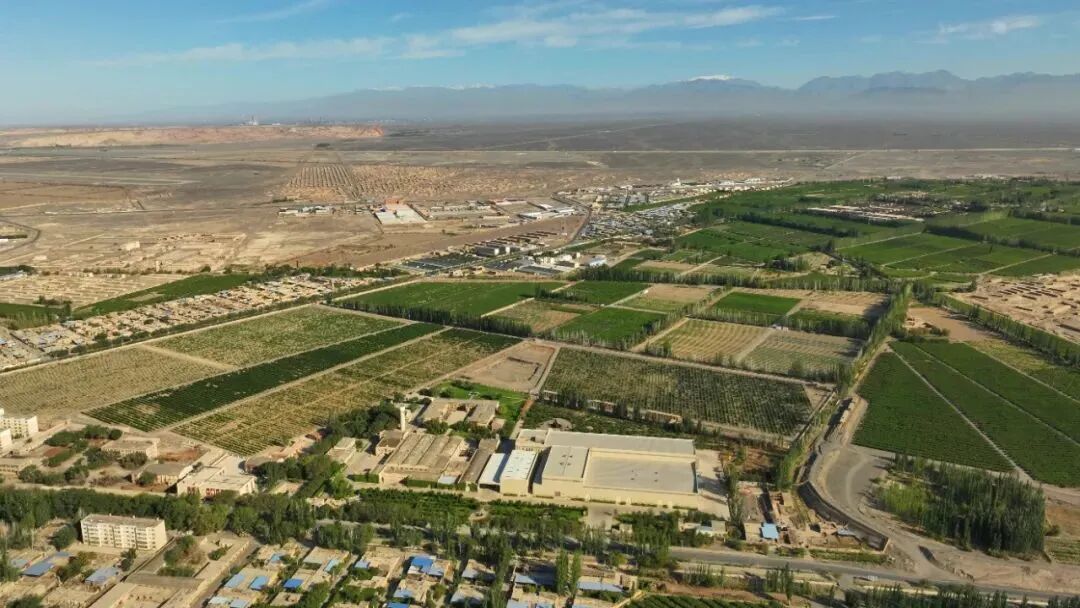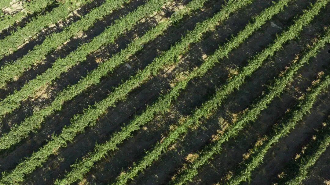 一半是葱郁绿洲,一半是无边大漠。它们中间,生长着一片片浩渺如海的葡萄园。 航拍的...