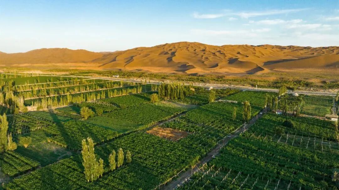 郁绿葱葱的葡萄园依偎在雄伟壮阔的沙山下,共享西域艳阳,共饮雪山玉露,造就一幅千年罕见与和谐共生的画面