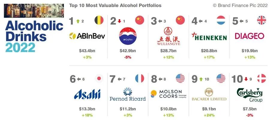 在“全球品牌组合价值最高的十大酒业集团”(Top 10 Most Valuable Alcohol Portfolios)榜单上,比利时的百威英博(AB InBev)升至首位。前十名还有:中国的贵州茅台、中国的五粮液(Wuliangye)、荷兰的喜力(Heineken)、英国的帝亚吉欧(Diageo)、日本的朝日(Asahi Group )、法国的保乐力加(Pernod Ricard)、美国的摩森康胜(Molson Coors)、美国的百加得(Bacardi)和丹麦的嘉士伯集团(Carlsberg Group)。