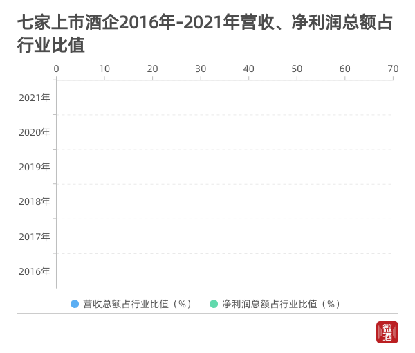 从图四来看,这七家酒企的营收、净利润总额占行业比值呈上升态势,在占比具体数值上,营收总额占比持续往50%靠拢,净利润总额占比自2017年起一直超过50%,甚至于2020年达到了66.79%。