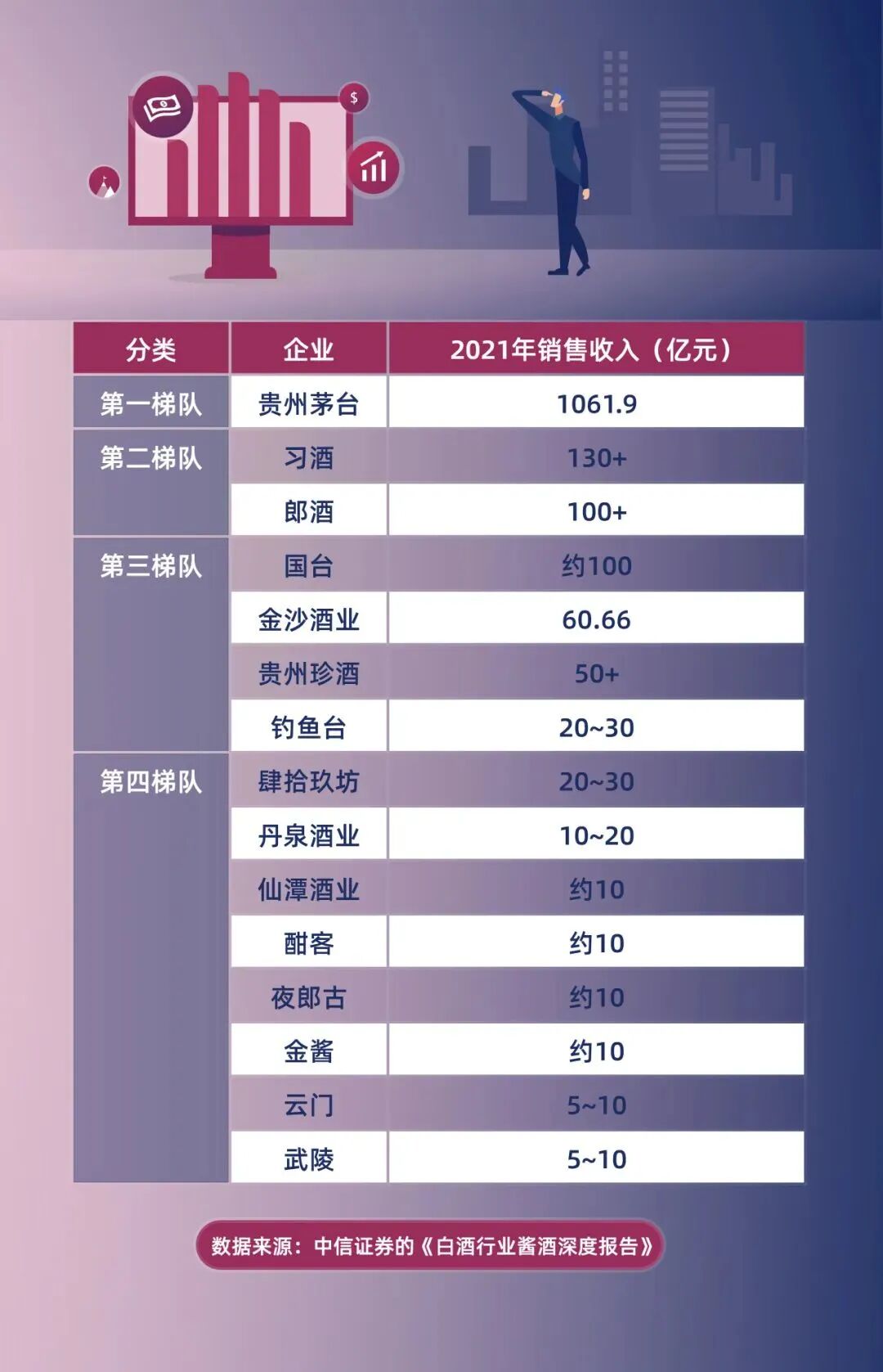 今年5月,中信证券发布了《白酒行业酱酒深度报告》,从中能够一窥当前酱酒企业的竞争格局。即使除开头部的贵州茅台、习酒、郎酒三家企业,第三、四梯队的酱酒企业也在2021年实现了超过310亿元的销售收入。