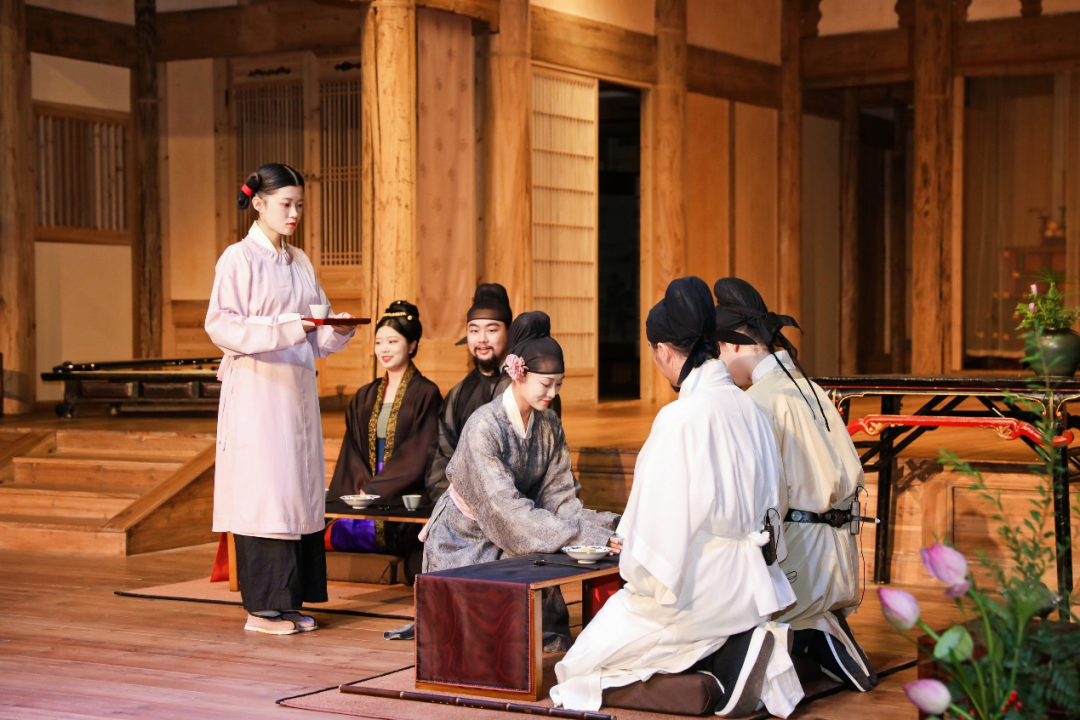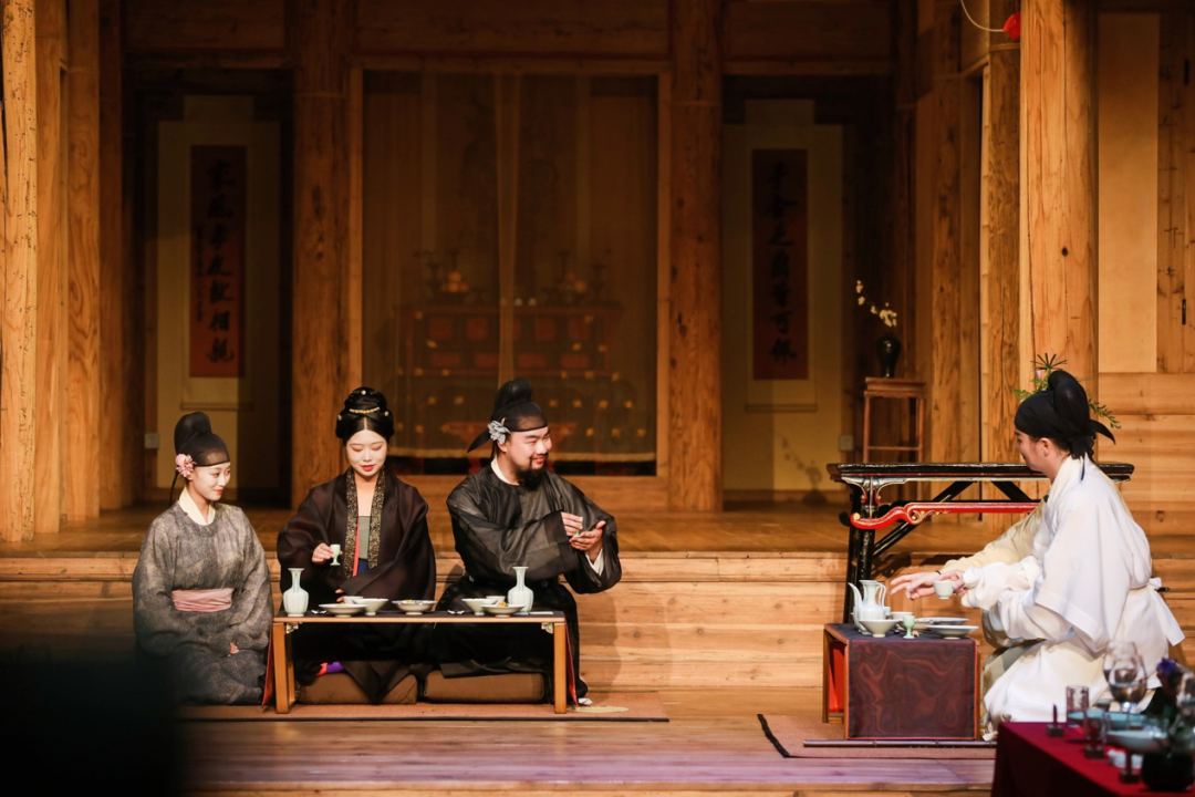 夜宴上,主人热情待客,邀友人饮茶吟诗、品酒鸣萧、听琴赏舞,不时与夫人窃窃私语,邀在座嘉宾举杯同庆,晚宴现场斛觞交错,和谐欢乐,好不热闹。随着舞台剧情推进而更换嘉宾菜品,品尝蟹酿橙、胡风羊排、银丝菊花盅等宋朝名菜,共赴“韩熙载夜宴”。