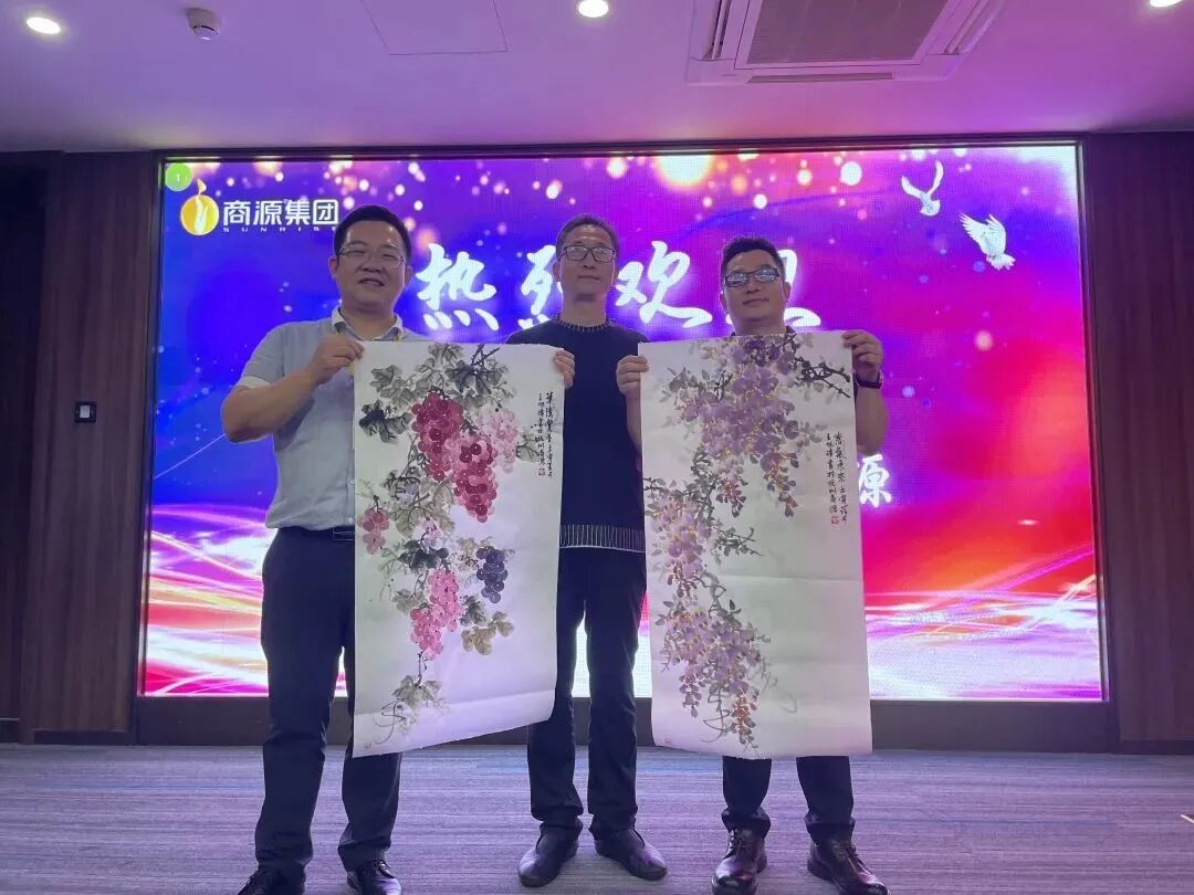 最后,韩主席代表武林汇全体同学向商源赠送了汝瓷冰裂纹摆件,以作纪念;名书法画家王旭璋先生也现场作画,赠礼商源两幅墨宝——紫葡萄与牡丹花。一场简单而不失隆重的赠礼,为今天的来访画上了圆满句号。
