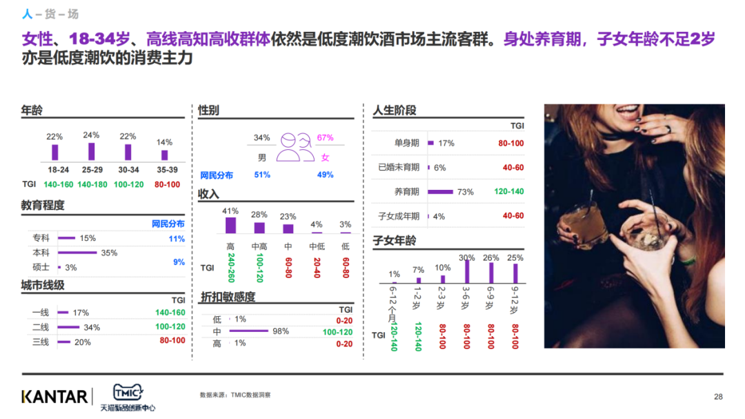 首先是“人”的部分,“她经济”与“社交属性”成为低度酒的主要驱动因素。报告指出:低度潮饮酒品类整体的消费群体仍以年轻、女性为主。其中,女性、18-34岁、高线高知高收群体依然是低度潮饮酒市场主流客群。身处养育期,子女年龄不足2岁的女性群体亦是低度潮饮的消费主力。