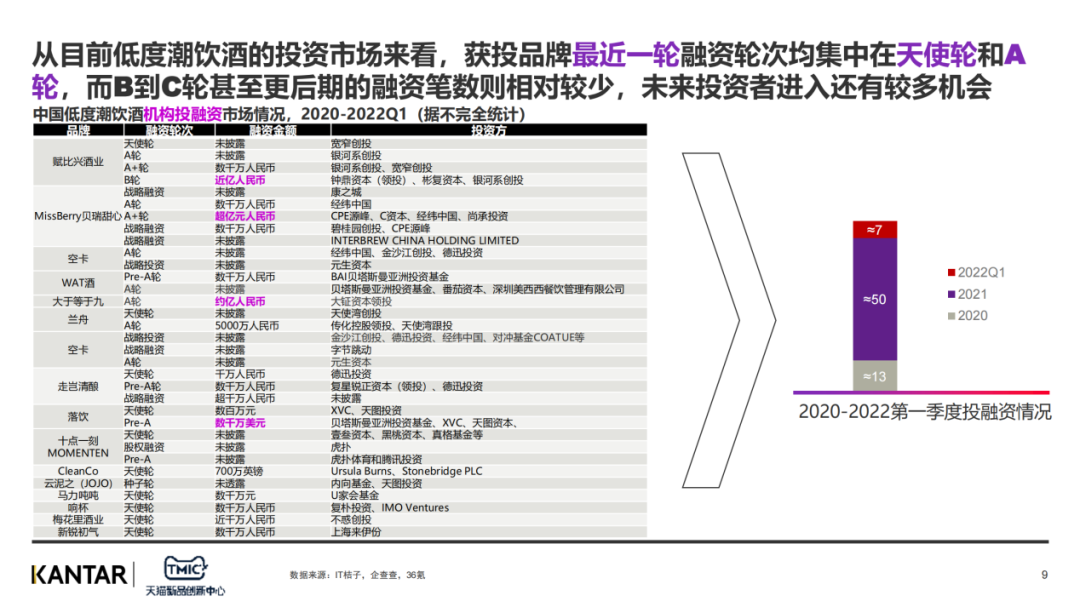值得注意的是,近两年低度酒市场的融资轮次集中在天使轮和A轮,未来投资者还有较多机会。除专业投资机构,酒企本身也孵化了一些诸如梅见、浮起为代表的低度潮饮品牌。
