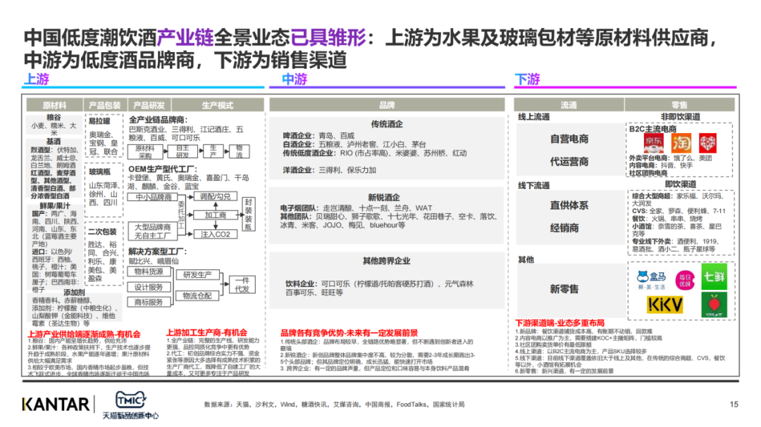 值得关注的是,在市场规模不断上涨、资本不断入局的同时,报告还指出,目前低度酒赛道的产业链全景业态已具雏形:上游为水果及玻璃包材等原材料供应商,中游为低度酒品牌商,下游为销售渠道。