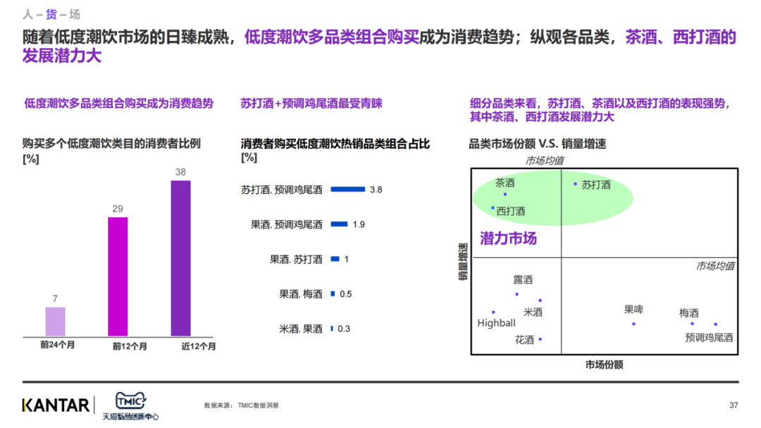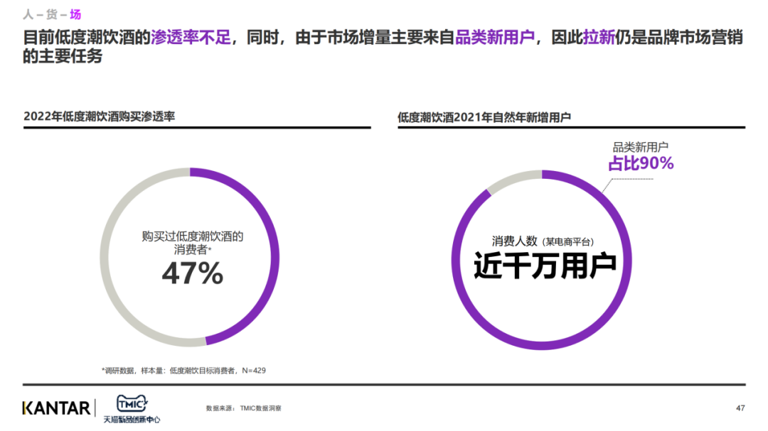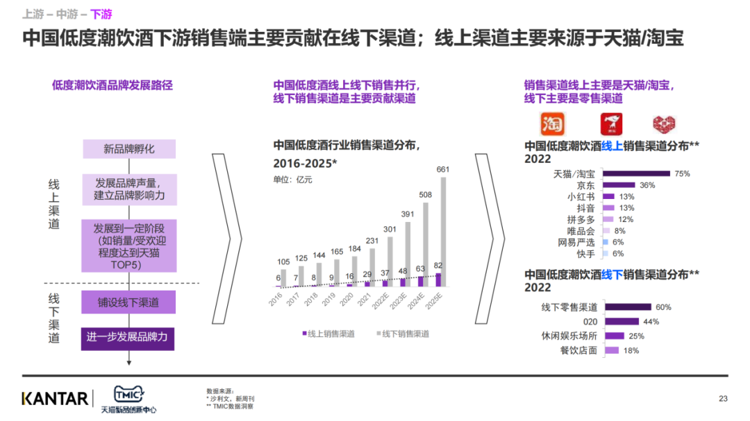 最后是“场”的部分,低度酒品牌需持续关注电商与社交媒体平台以实现用户拉新。报告强调,目前低度潮饮酒的渗透率不足,同时,由于市场增量主要来自品类新用户,因此拉新仍是品牌市场营销的主要任务。而通过数据显示,电商与社交媒体对于消费者的影响是不可忽视的,因此借助营销手段打造线上线下的运营通路以实现全域闭环经营是低度酒品牌下一步的重头戏。