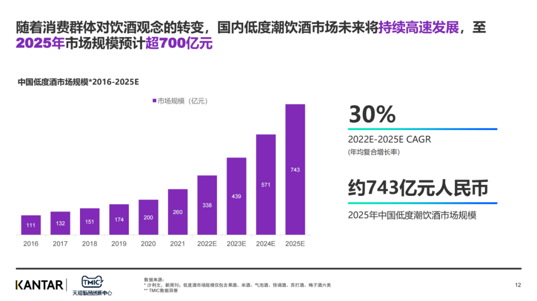 近日,天猫新品创新中心(TMIC)联合百润股份、凯度咨询发布《2022年低度潮饮趋势报告》(以下简称报告)。据报告显示,2022年我国低度潮饮酒市场规模预测达到338亿元,至2025年市场规模预计将超700亿元。