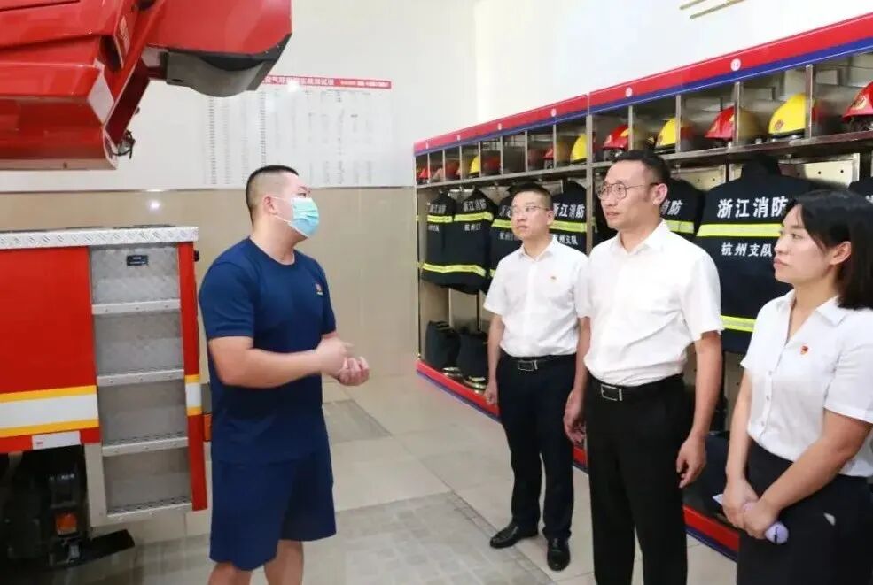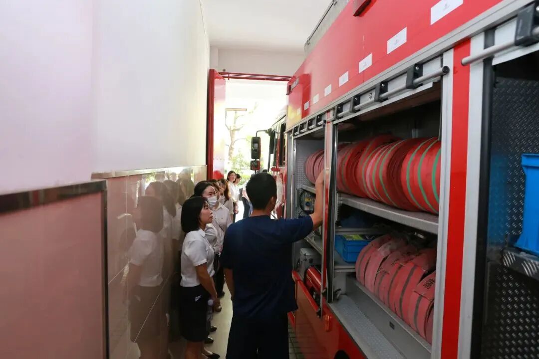 大家实地参观古荡消防中队,现场学习不同作业环境下每辆消防车的功能和作用以及车辆所载器材的具体使用方法,了解消防员的工作流程。短短20分钟的介绍时间,参观人员挥汗如雨,酷热难耐,但这却是消防员最平凡的日常。通过近距离沟通交流,支部党员真切感受到消防员们使命在肩的大爱力量。