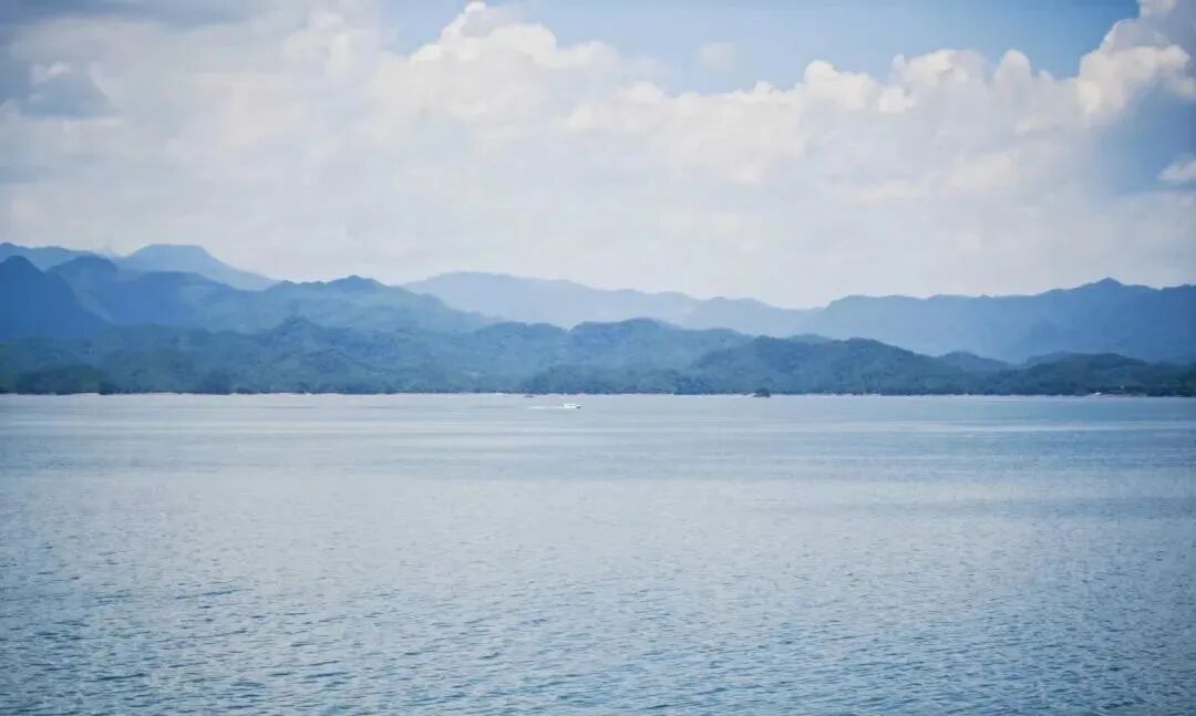 坐船游湖看碧波万倾、千岛竟秀、群山叠翠,夏天的风迎面吹来,太阳的光辉把这里照耀得格外耀眼,郁郁葱葱的树木漫山遍野,清澈的湖面宛如一面明亮的银镜,闪闪发光。天空与湖水似乎融为了一体,不禁让人感叹大自然的巧夺天工。