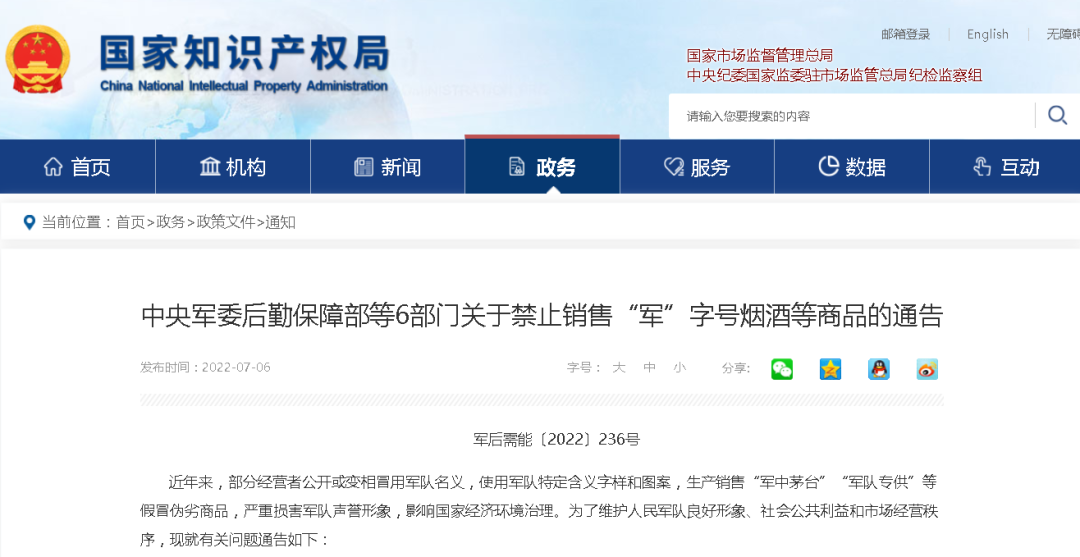 据国家知识产权局网站,7月6日,中央军委后勤保障部、中央网络安全和信息化委员会办公室、中华人民共和国公安部、国家市场监督管理总局、国家烟草专卖局和国家知识产权局6部门发布关于禁止销售“军”字号烟酒等商品的通告。