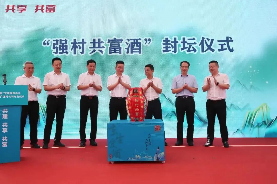 ▲市委组织部常务副部长周树森,绍兴市国资委党委书记、主任徐洪,原绍兴市人民政府副秘书长施新民,绍兴黄酒集团党委书记、董事长孙爱保,新昌县人大常委会党组书记、主任邵永明,新昌县委常委、组织部长王黄河,新昌七星街道党工委书记俞均坪共同为“强村共富酒”封坛