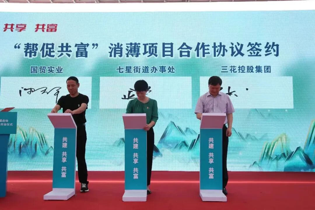 ▲新昌七星街道党工委副书记、主任金若华与三花控股集团、国贸实业签订“帮促共富”消薄项目合作协议