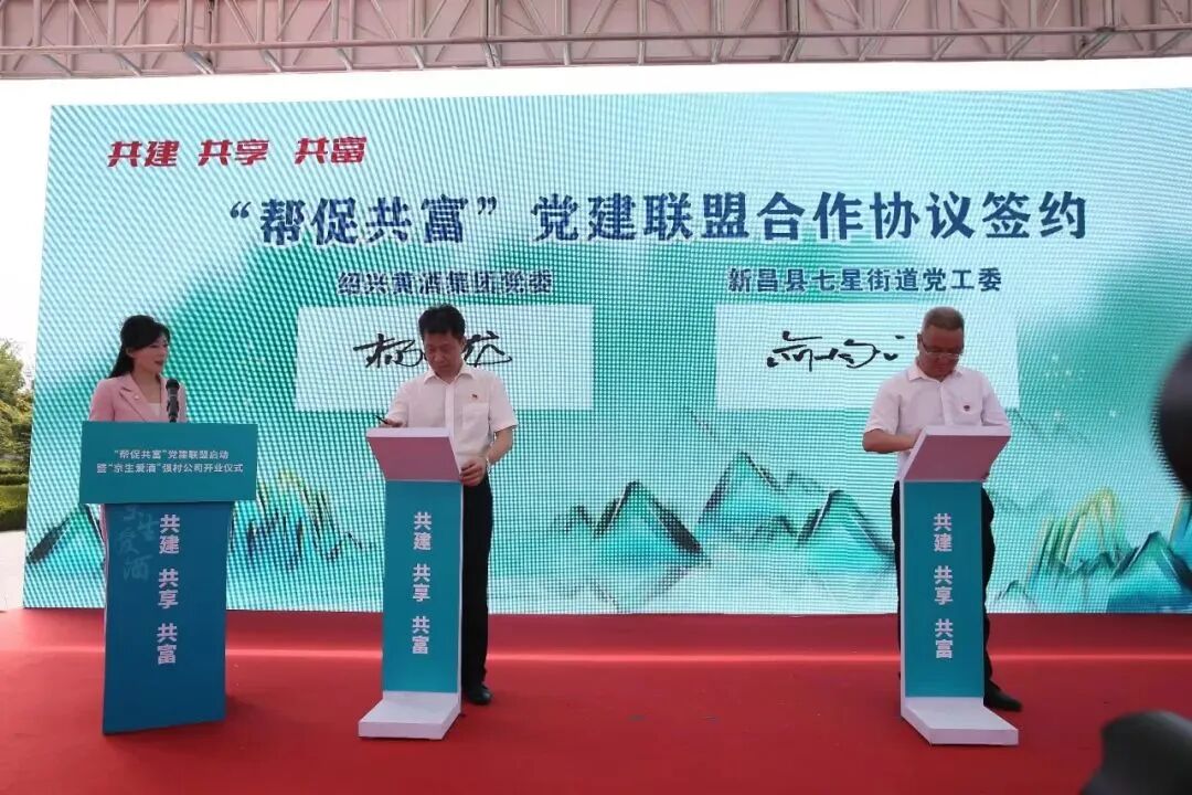 ▲绍兴黄酒集团(古越龙山股份公司)党委副书记杨文龙与新昌县七星街道党工委书记俞均坪签订“帮促共富”党建联盟合作协议