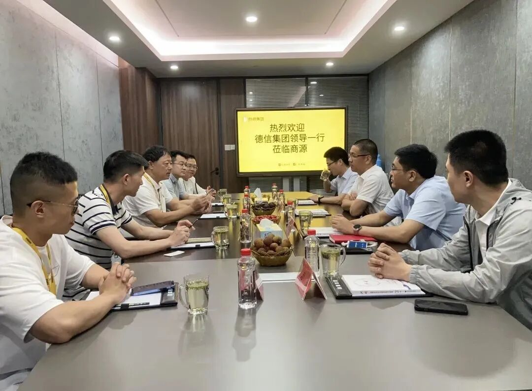 6月27日上午,德信控股集团董事长胡一平,带领德信服务集团执行董事兼总裁唐俊杰、德信控股集团战略投资中心副总经理朱忠良、杭州桔邻生活总经理程超一行来访商源。商源集团董事长兼总裁朱跃明、副总裁刘旭华携相关团队负责人进行了热情接待。双方进行了充分的沟通交流,探讨跨界合作的机会。