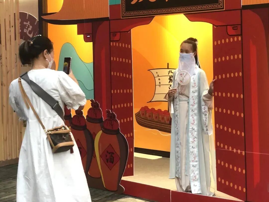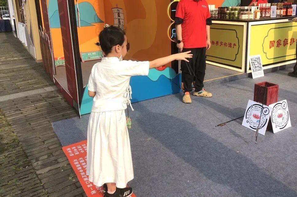 “扫码关注,参与投壶游戏,投中就有奖品......”工作人员刚把游戏道具拿出来,展位前就立马聚拢了许多现场观众。