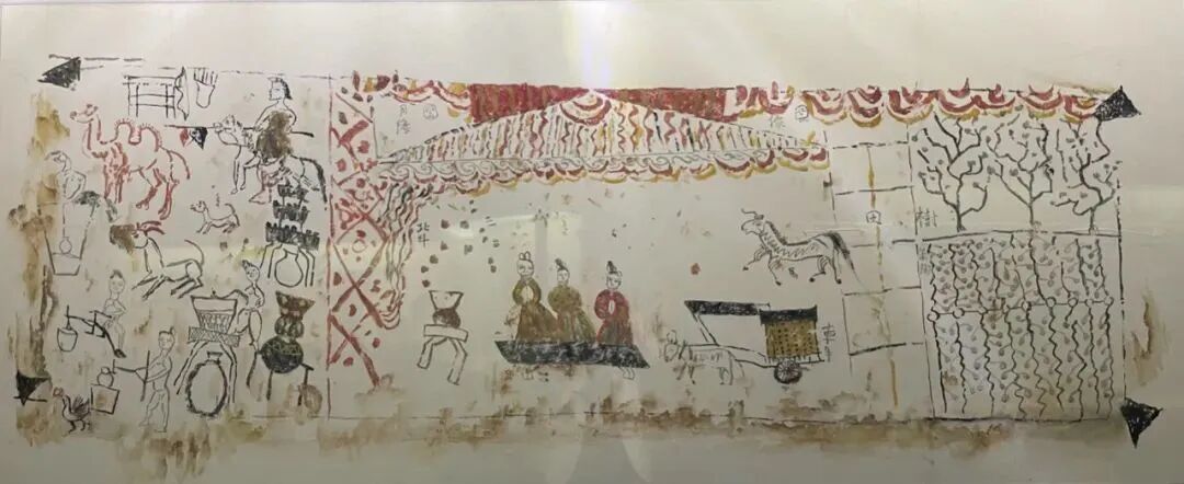在壁画的右下角画有井字形田地、藤蔓状葡萄,并有“蒲陶”二字,壁画左侧则再现了葡萄酿酒从榨汁到蒸馏等全过程。