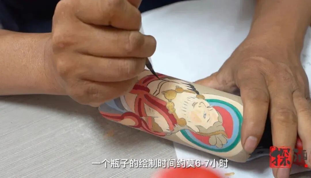 绘画前,他会用生土打底来当作画纸,再根据线描稿一点点将壁画复刻在酒瓶上。