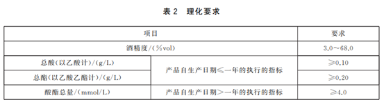理化要求相较于国标要求的各类固态法白酒,主要拓宽了酒精度范围,迎合国家相关部委提倡的轻工产业增加升级创新产品,“针对年轻消费群体、国外消费群体发展多样化、时尚化、个性化、低度化白酒产品”的发展策略。总酸和总酯指标考虑到实际贮存过程中醇、酸、酯、醛等成分发生缓慢的氧化、还原、酯化与水解等化学反应而逐渐趋于平衡,故一年后以酸酯总量要求,根据计算确定。