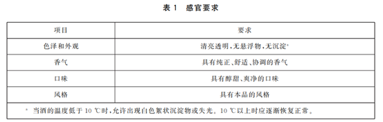 感官要求参考GB/T 20821《液态法白酒》和GB/T 20822《固液法白酒》的部分要求,保障了“具有白酒风格的配制酒”定义要求,具体区别在于删除了部分描述性词汇以便拓宽调香白酒产品发展空间,增加产品丰富度和灵活度。