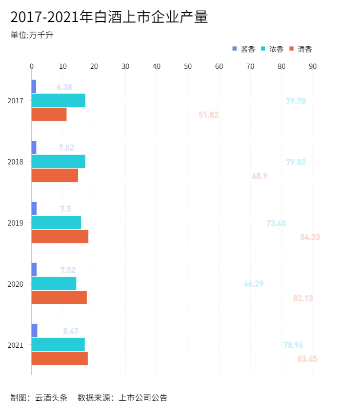五年间,浓清酱三香整体营收规模均实现约两倍增长。其中在浓香板块,2021年12家浓香型白酒上市公司的营收总额为1510.8亿元,比酱香型企业多448亿元,其78.96万千升的产量则在19家白酒类上市企业中占比43.49%,是酱香型企业的近十倍。