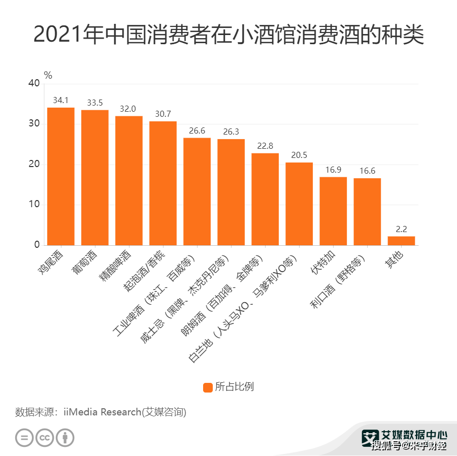 据艾媒咨询数据显示,2021年中国白领群体消费者在小酒馆消费酒的种类位居前五位的分别是鸡尾酒、起泡酒/香槟、葡萄酒、精酿啤酒和工业啤酒。
