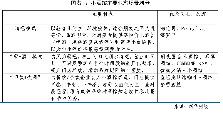 小酒馆,顾名思义就是为上班族、大学生、背包客等消费群体提供喝酒、餐饮、娱乐的小型社交场所。据了解,小酒馆收入来源为销售酒饮及小吃,门店面积较小且配置相对简单,约100-500平方米,人均消费为50-300元;夜店另设入场费,人均消费为300-2000元;卡拉OK另设场地租金及最低消费限制,门店面积一般超过2000平方米,需配置点歌设备等。