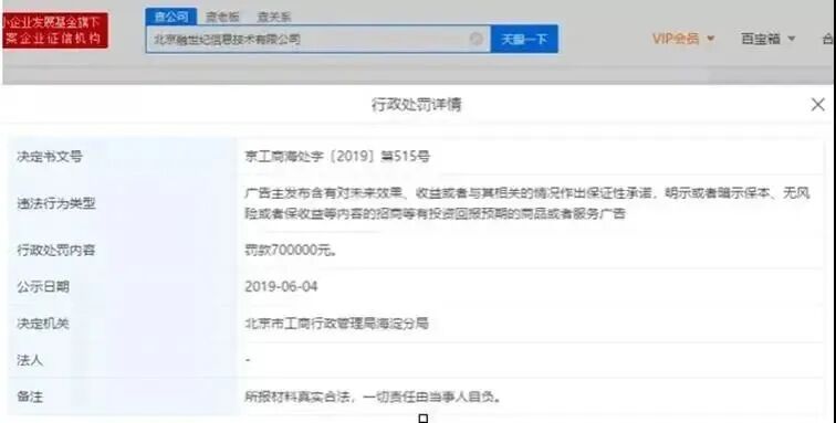 2019年6月4日,互联网金融垂直搜索平台融360母公司北京融世纪信息技术有限公司因含有“对未来收益进行保证性承诺”被罚款70万元。