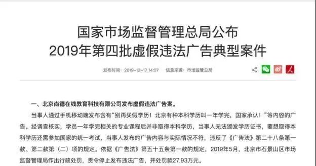 北京尚德在线教育科技有限公司在广告中宣称“一年学完,国家承认”,实际无法颁发学历证书,被罚款27.93万元。