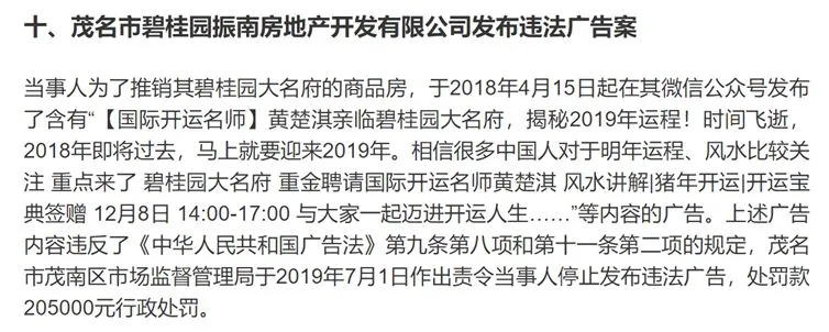 2019年,茂名市碧桂园发布“重金聘请国际开运名师黄楚淇风水讲解、猪年开运、开运宝典签赠”的广告,因涉及迷信内容被罚20.5万元。