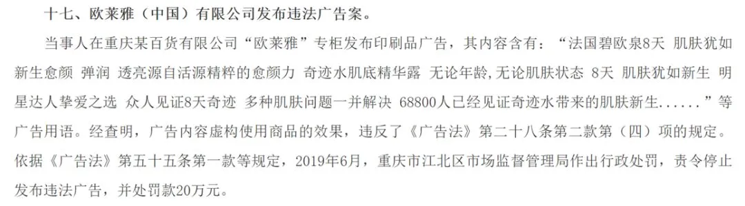 欧莱雅(中国)有限公司发布 “无论年龄、无论肌肤状态,8天肌肤犹如新生”等虚构商品使用效果的虚假内容广告,被罚款20万元。