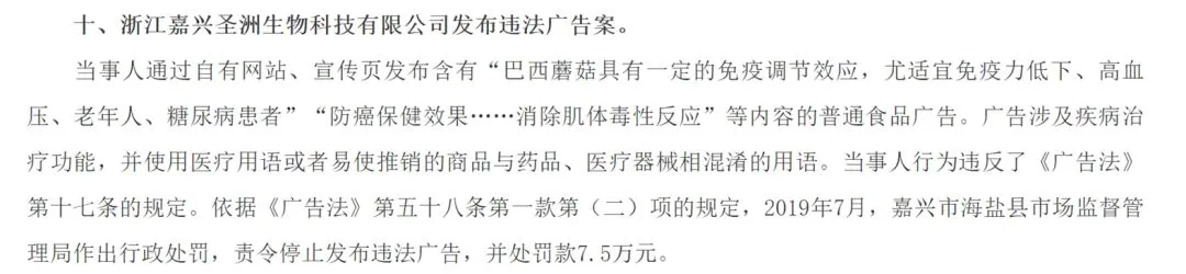 2019年,浙江嘉兴圣洲生物科技有限公司因发布涉及疾病治疗功能、使用医疗用语的普通食品广告“巴西蘑菇”,被罚款7.5万元。