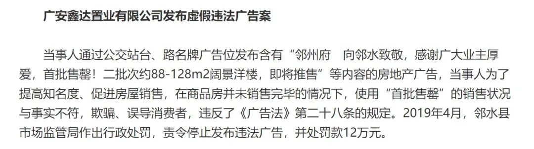 2019年10月,四川广安鑫达置业有限公司因发布的广告中包含“首批售罄”字样,被罚款12万元。