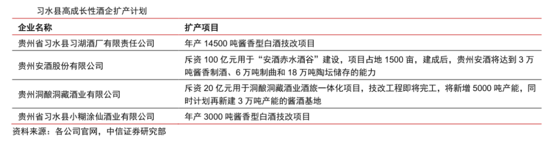 下游习水产量超过10万吨,酱香占比95%以上。习水县位于赤水河中下游,共有15家白酒生产企业,知名酒企习酒、安酒、云峰小糊涂仙、以及茅台集团201厂均坐落在习水县。2021年,习水县基酒产量12.4万吨,2016-2021年CAGR为36%,2025年力争30万吨,而酱香作为主导香型产量占比超过95%。作为产区的龙头企业,习酒总产量已达到4万吨,安酒在万吨储能的基础上斥资百亿用于建设安酒赤水酒谷,建成后酱香产能将达到3万吨。两大品牌之外,习湖、云峰小糊涂仙、洞酿洞藏等多家高成长性酒企也纷纷增产扩能。