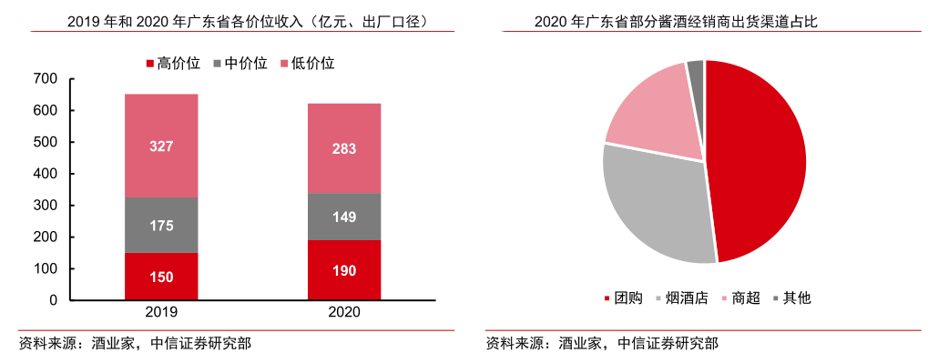 梯队明显,传统渠道渗透率仍有较大提升空间。目前,广东市场酱酒格局已形成明显的梯队。首先,茅台以及茅台系列酒一支独秀,遥遥领先。其次,习酒受益茅台品牌效应以及大单品的成功打造,2020年回款已经超过10亿元;郎酒凭借深厚的品牌积累早在消费者心中有较好的认知,整体在广东省的销售规模约5-10亿元;国台凭借自身多年的精修内功以及广东大商粤强的精心运作,实现较快增长,预计规模也在5-10亿元。最后,金沙、钓鱼台、丹泉、珍酒、酣客、肆拾玖坊等企业也实现过亿收入。根据酒业家统计,目前广东地区酱酒市场仍以团购渠道为主,经销商出货口径下团购占比为48%,同时,广州和深圳占广东省酱酒份额约60%。未来酱酒市场发展无论是团购向流通导入还是渠道下沉均有较大成长空间。