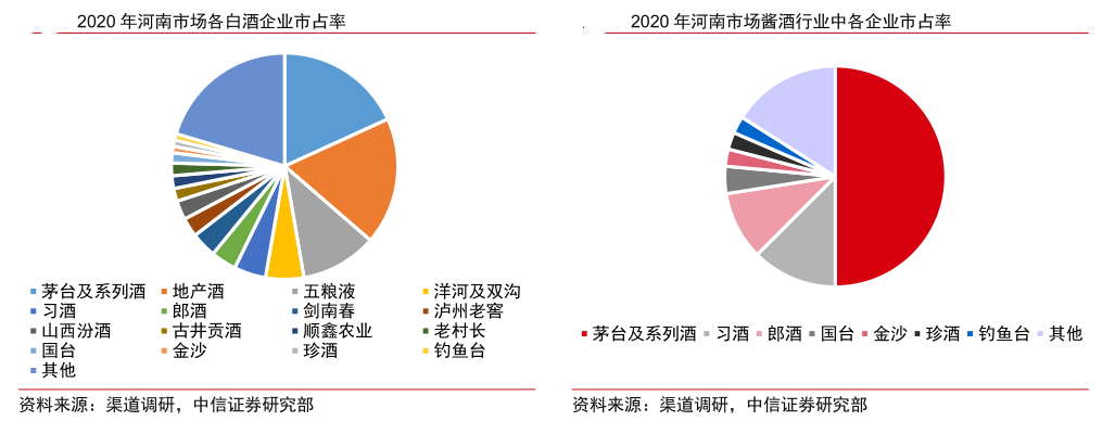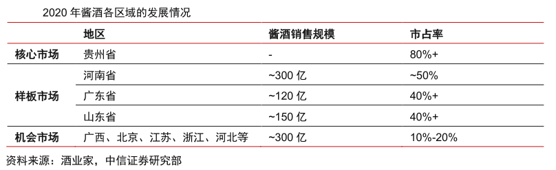 河南酱酒市场:2020年酱酒市场规模达到240亿元,酱酒“第二故乡”。河南市场属于人口和白酒消费大省,由于地产酒表现较为弱势,常年处于各大名酒企业群雄割据的局面,历来是各大酒企宣传推广和市场攻坚的核心市场,也是酱酒企业逐鹿的桥头堡。根据河南省酒业协会会长熊玉亮统计,河南市场贡献了习酒全国1/4的销售、金沙全国1/4的销售、国台全国1/8的销售、茅台集团全国1/12的销售。2020年,酱酒在河南实现240亿元的销售(含省外调货),茅台及系列酒销售规模达到约100亿元、习酒约25亿元、郎酒约20亿元、国台、金沙等约10亿元左右。
