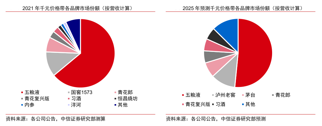 千元价格带持续扩容,酱酒后来居上。我们预计,2021年千元价格带白酒整体营收规模约700亿元,其中千元价格带中酱酒规模约100亿元左右,未来受益茅台需求外溢红利望持续扩容,2025年千元价格带酱酒规模望达到300-400亿元,预计占千元价格带规模的25%。目前,千元价格带中以浓香五粮液、国窖1573为代表的浓香酒占据主导地位,2021年二者合计份额为76%(按营收计算)。但近两年来青花郎、君品习酒、茅台1935等千元酱酒均发展迅猛,尤其是茅台1935呈现出快速进攻之势,千元酱酒份额稳中有升趋势具有较强确定性。