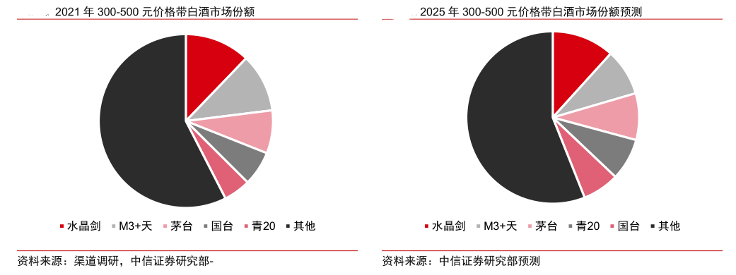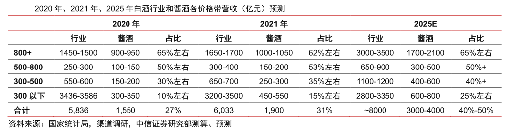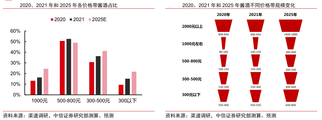 未来酱酒望占次高端价格带半壁江山。酱酒由于较高的综合生产成本,酒企主流大产品基本均定位在次高端及以上价格带,由于高端酒需要具备较强的品牌力和时间积淀,因此酱酒大部分畅销或者放量产品集中在300-800元的次高端价格带,具体行业竞争格局上文已有分析,此处不再赘述。我们认为未来在消费升级和中产阶级扩容的基础下,次高端白酒行业将持续扩容,酱酒伴随产能逐步释放有望充分享受次高端升级和扩容红利。我们预计,2025年酱酒在300-800元的次高端价格带有望实现800-1000亿营收规模、年均复合增速约 25%。由于摘要和窖藏1988的出色表现,预计500-800元价格带酱酒份额有望超过50%;伴随茅台汉酱、国台国标酒、珍15等逐步发力,300-500元价格带市场份额望超过40%。