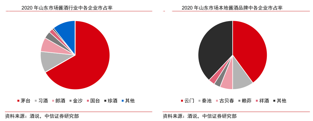 山东酱酒市场:2020年酱酒市场规模约150亿,2021年预计持续扩容至200亿。山东省作为经济强省、人口大省和重要酱酒产区之一,酱酒消费体量庞大。地产酒势弱而分散,主要定位中低端及低端市场,以200-300元价格带为主,由于外埠市场开发力度不足、营销手段较为粗放,未能形成具有代表性的大单品或是全国知名度较高的品牌,导致省外名酒如茅台、习酒、郎酒等瓜分了大量市场份额,牢牢占据次高端及高端价格带。在150亿的市场里,位于第一梯队的茅台及系列酒销售规模达到100亿元,位于第二梯队的习酒和郎酒分别为15亿和10亿,金沙规模超5亿,国台规模约2-3亿,珍酒也实现过亿规模。