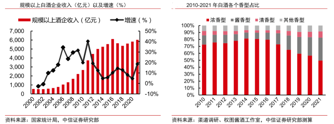 2021年,国内规模以上白酒企业营业收入达到6033亿元,过去 5/10年复合增速(按照可比增速口径推算,非营收绝对值口径)分别为11.0%/13.8%,分香型来看酱香型白酒整体增长最快,复合增速分别为17.1%/26.6%。按照营收规模计算,2021年浓香/酱香/清香/其他香型占比分别为50%/33%/9%/9%,相较2016年分别变动-30pcts/+23pcts/+5pcts/+2pcts。
